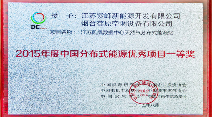 中國能源研究會、中國電機(jī)工程學(xué)會等6家單位聯(lián)合授予江蘇紫峰新能源開發(fā)有限公司&煙臺荏原空調(diào)設(shè)備有限公司《2015年度中國分布式能源**項(xiàng)目一等獎》的榮譽(yù)。