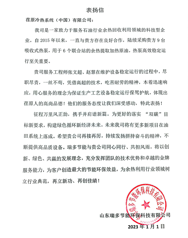 這一封來自客戶表揚(yáng)信的背后,展現(xiàn)的是每一位售后人員的敬業(yè)精神,傳遞的是客戶對(duì)荏原冷熱(中國(guó))服務(wù)團(tuán)隊(duì)的信任,每一封表揚(yáng)信都是對(duì)服務(wù)人員的肯定,更激勵(lì)著服務(wù)人員繼續(xù)勇毅前行,為客戶提供更好的產(chǎn)品和服務(wù),用實(shí)際行動(dòng)回饋往日客戶對(duì)荏原冷熱(中國(guó))的信任與期待!