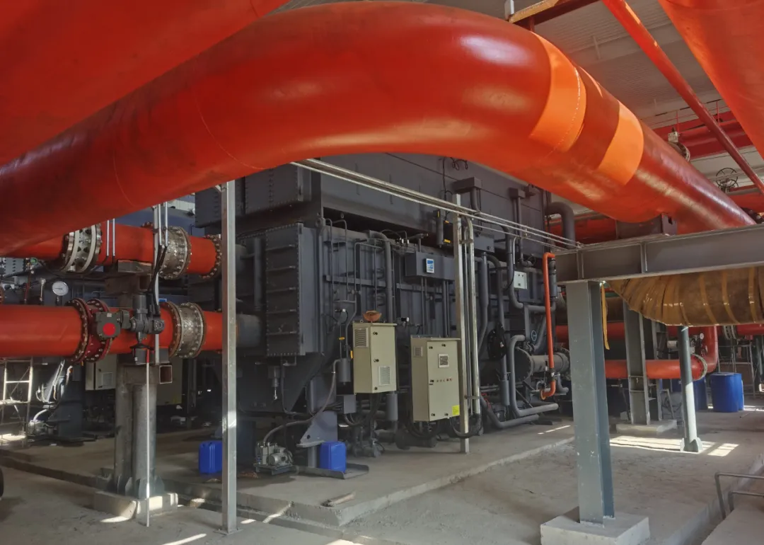 荏原將區(qū)域內(nèi)清潔供暖改造需求細(xì)致分類、精準(zhǔn)落地,為兩期項目定制了以溴化鋰吸收式熱泵為核心的系統(tǒng)解決方案。中節(jié)能電廠供熱首站,作為項目的關(guān)鍵設(shè)施之一,總建筑面積達(dá)到1802㎡,供熱能力高達(dá)71MW,具有規(guī)模與效率雙重優(yōu)勢。在這里,通過透平熱泵機(jī)組+溴化鋰熱泵+凝水板換的三級利用技術(shù),電廠循環(huán)水中的余熱被高效提取并轉(zhuǎn)化為寶貴的熱能資源。這一創(chuàng)新技術(shù)路線的實施,不僅實現(xiàn)了主蒸汽最大程度的階梯利用,更將國內(nèi)工業(yè)余熱利用的技術(shù)水平推向了一個新的高度。