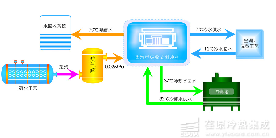 ??????荏原公司與輪胎企業(yè)的合作開發(fā)了硫化蒸汽回收裝置,經(jīng)實(shí)測回收的蒸汽壓力約為0.02MPa,可作為荏原低壓蒸汽型吸收式制冷機(jī)的驅(qū)動熱源,利用回收的余熱制取低溫冷水滿足工藝用冷需求??扇〈娭评錂C(jī)組,節(jié)約電耗,幾乎不產(chǎn)生運(yùn)行費(fèi)用,并解決了輪胎廠“冒白氣”的問題。經(jīng)濟(jì)效益與環(huán)境效益顯著,在橡膠輪胎行業(yè)迅速得到了推廣。